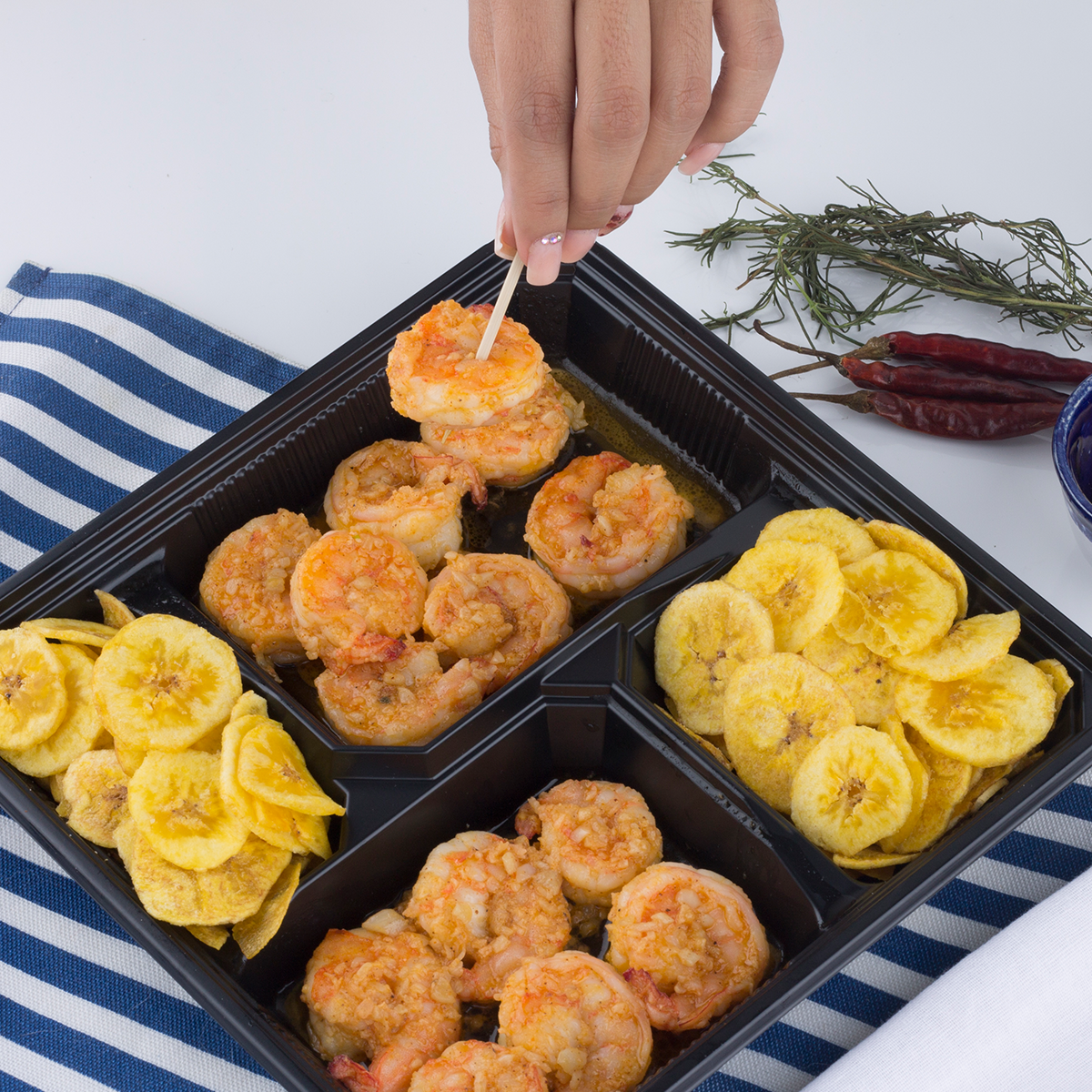 Langostinos de mar tamaño 16-21, cantidad 20 langostinos sazonados con ajo y aceite de oliva y un toque de pimienta de Cayenne, acompañados de funda de chifle.