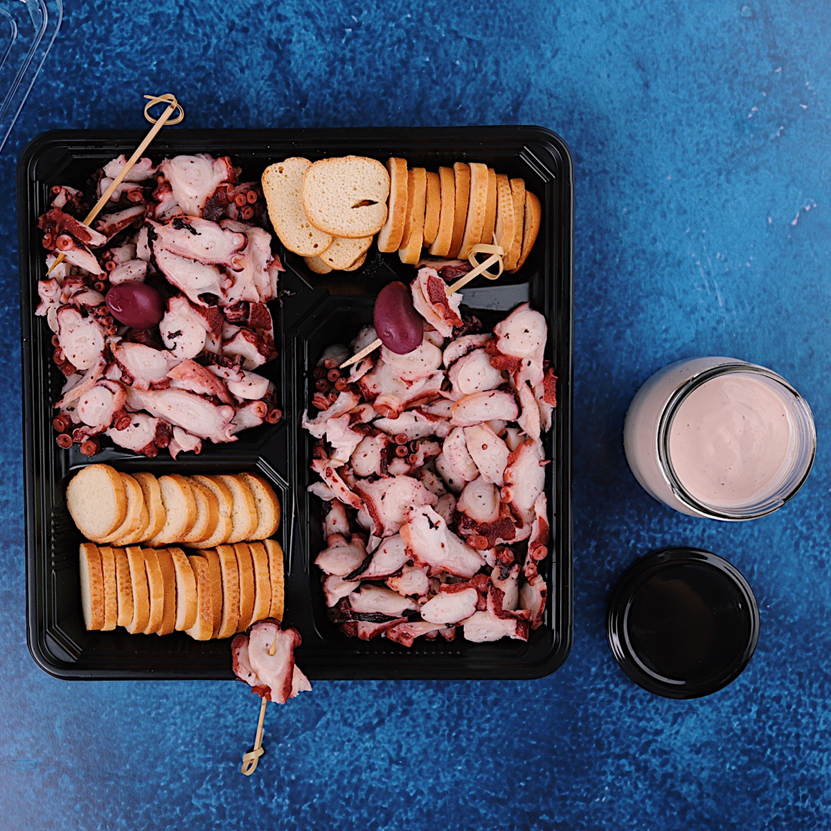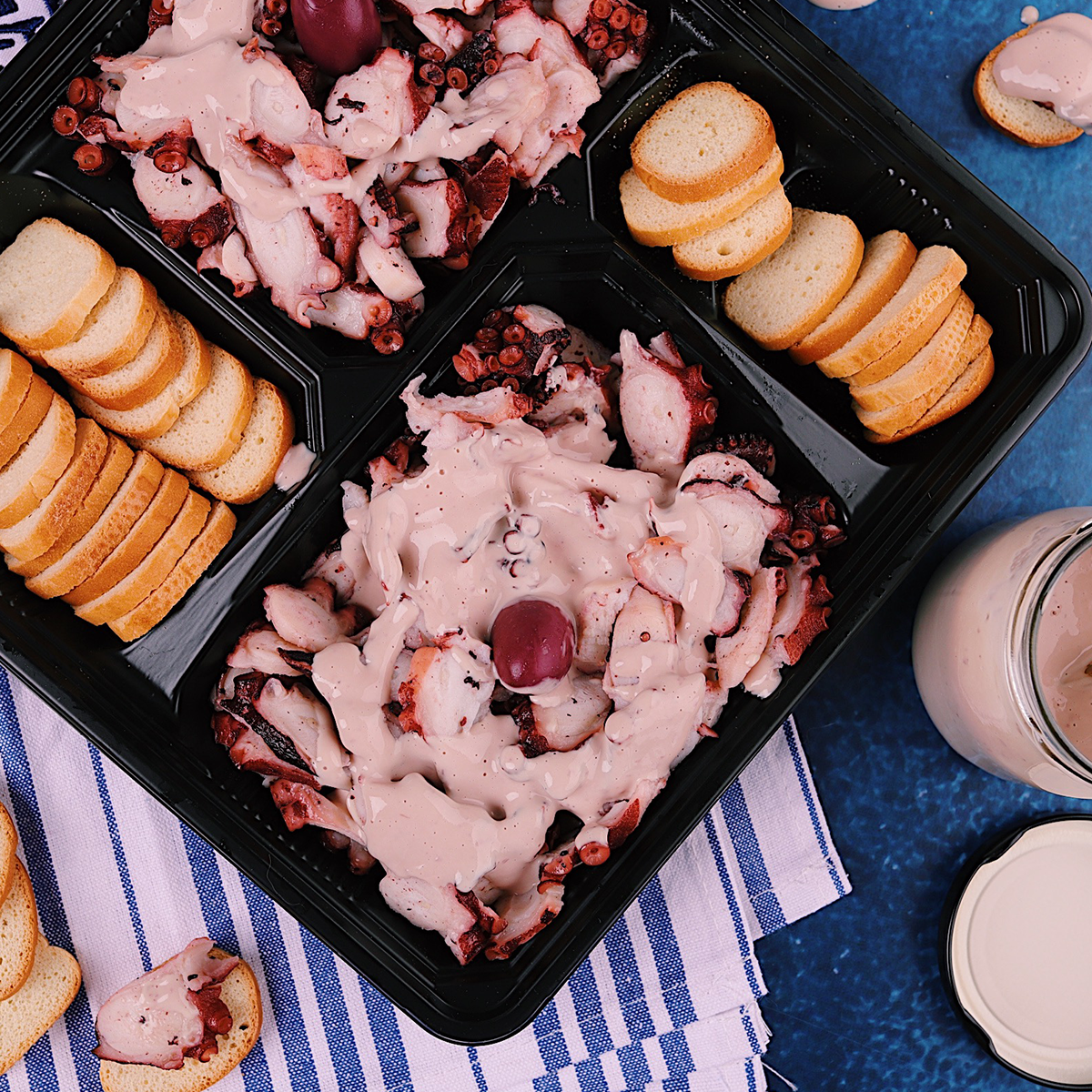 Pulpo cocido cortado en rodajas acompañado de tostatidas, salsa viene en un frasco aparte. Ingredientes de salsa: mayonesa, aceitunas negras, sal y pimienta.